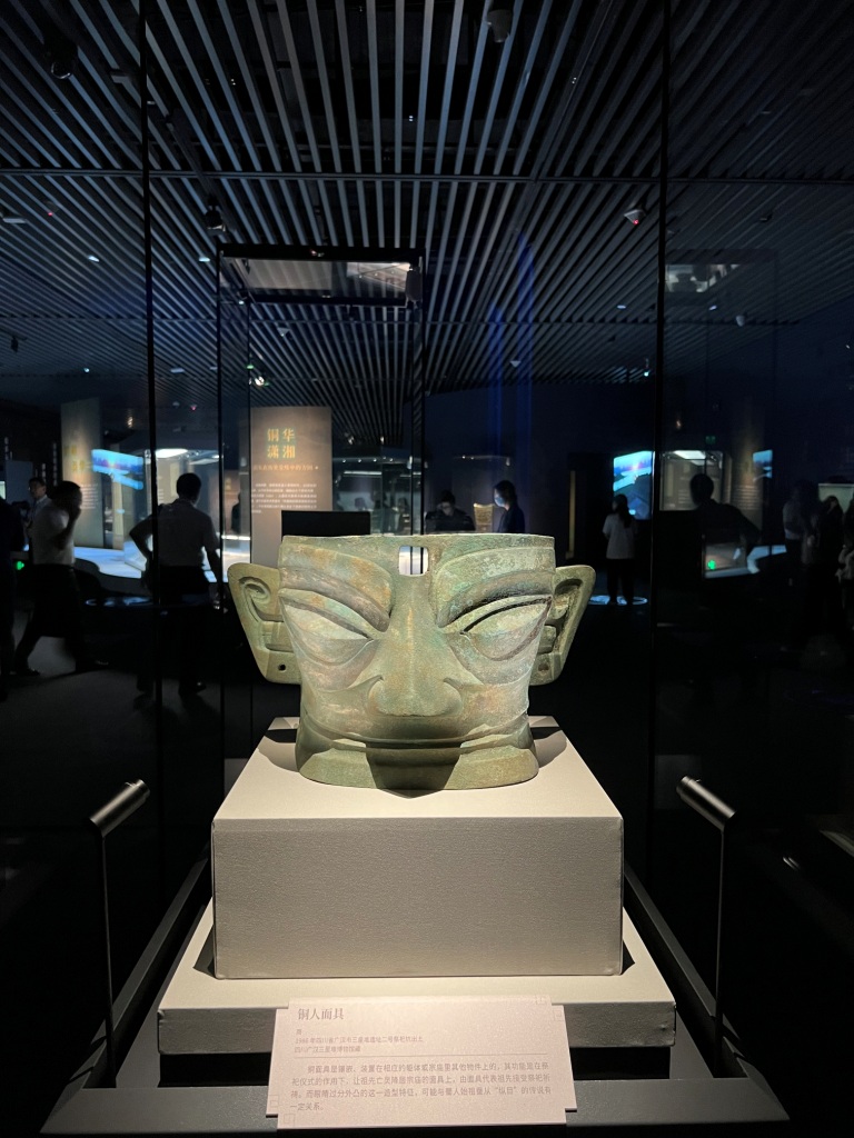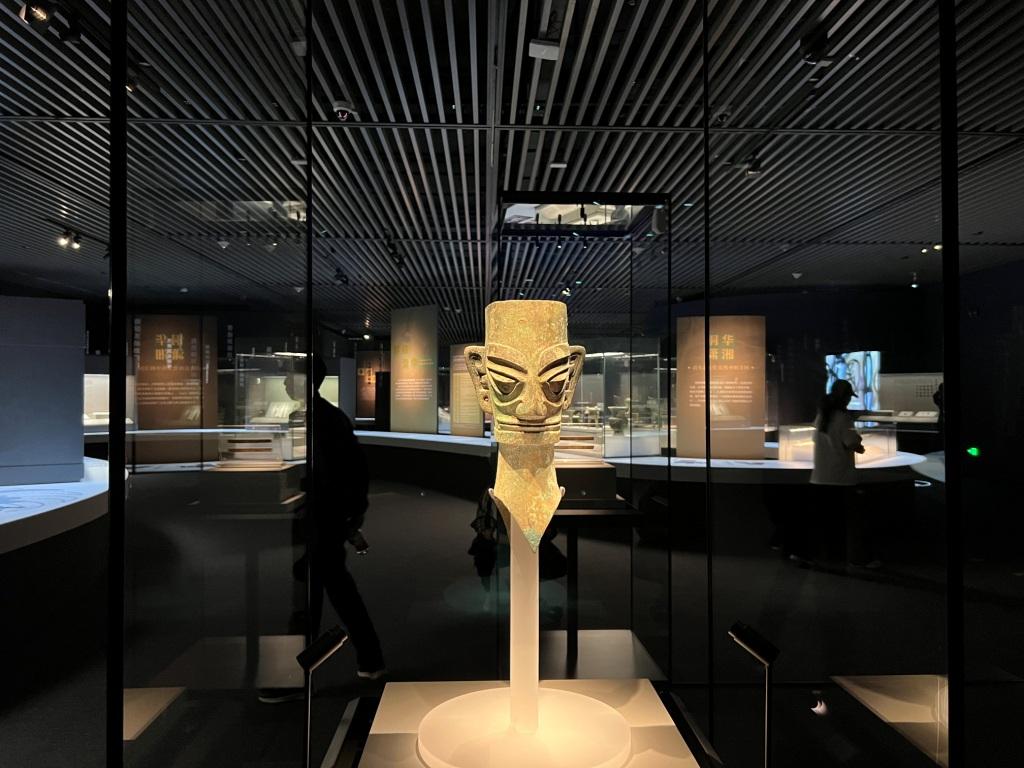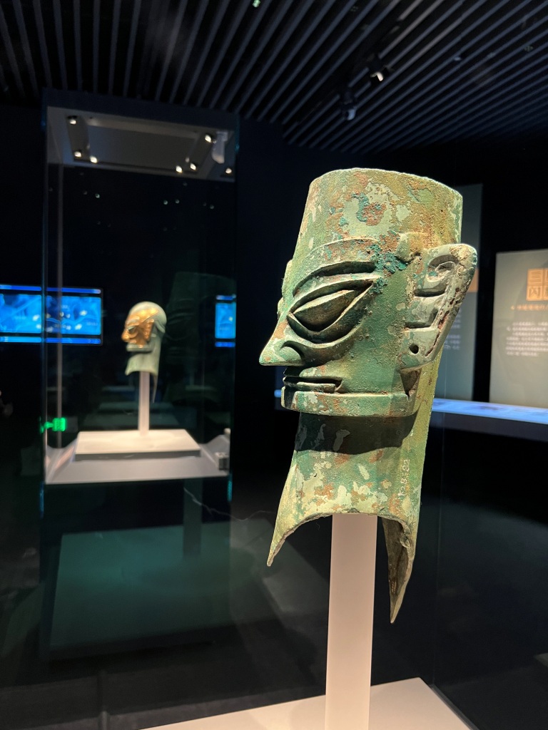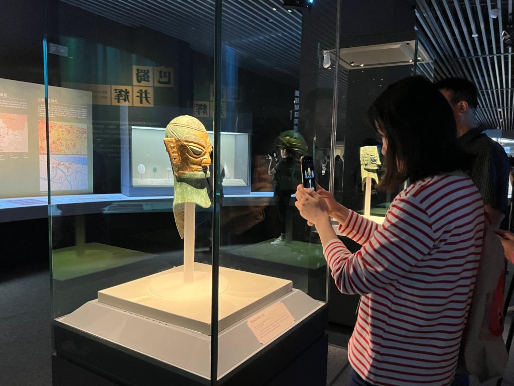 展览以长江流域上、中、下游的主要青铜文化圈为主线构架,分“巴蜀并辉”“群雄竞华”“多元一体”“天下归一”四个单元。在“巴蜀并辉”单元,来自三星堆遗址的多件青铜器成了展厅中的热门展品,吸引了众多观众。其中,戴金面罩青铜人头像光彩夺目、气宇非凡。四川广汉三星堆博物馆副馆长董静介绍,青铜人头像上包贴金面罩,说明当时的古蜀人已视黄金为尊,也非常娴熟地掌握了铜和金的加工技术。金面罩薄如蝉翼,仿若一张“黄金面膜”,3000多年前的古蜀人如何将其精确戴在青铜人头像上?董静介绍,古蜀人用黄金捶拓出金皮,再用生漆调和石灰做黏合剂,根据青铜人头像的造型轮廓,精准贴合上去。“3000多年后,依然浑然天成,光彩夺目。”