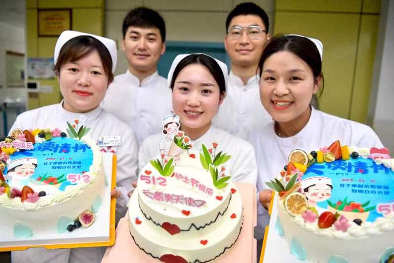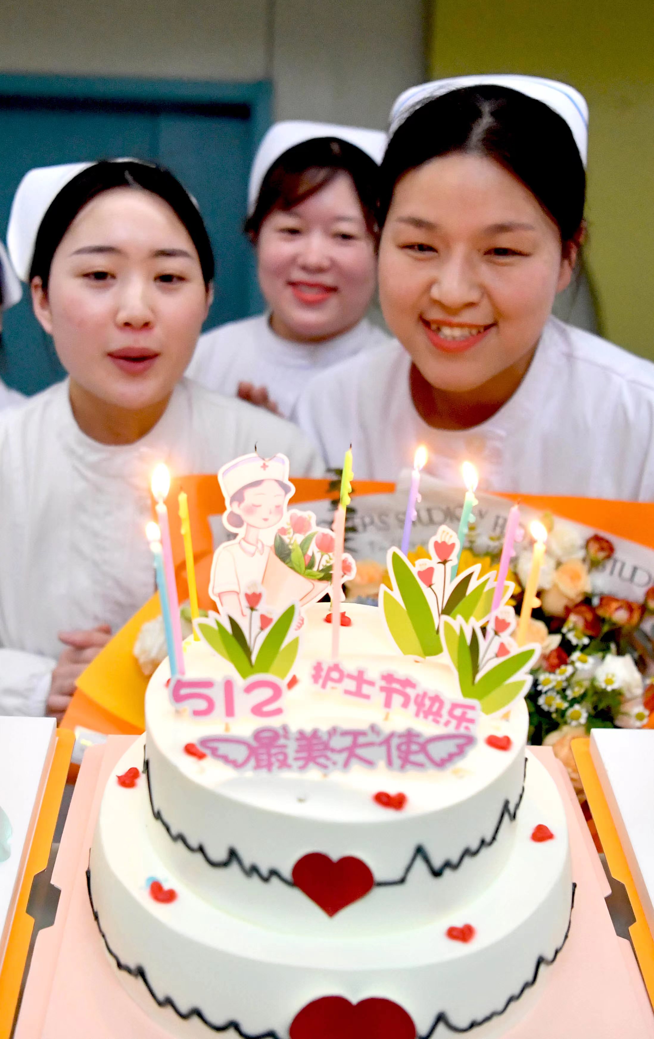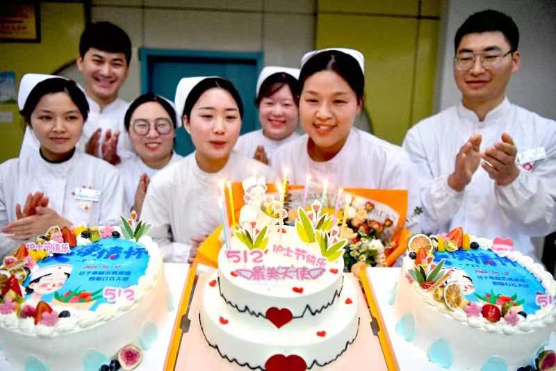 5月12日,在亳州市中医院,几名护士为蛋糕点上节日蜡烛,欢度“5.12国际护士节”。