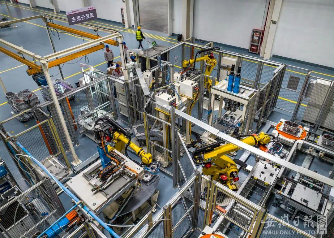 资料图:芜湖埃科动力系统有限公司,技术工人和工业机器人在奇瑞C-DM超级动力智能生产线上生产作业。(肖本祥 摄)