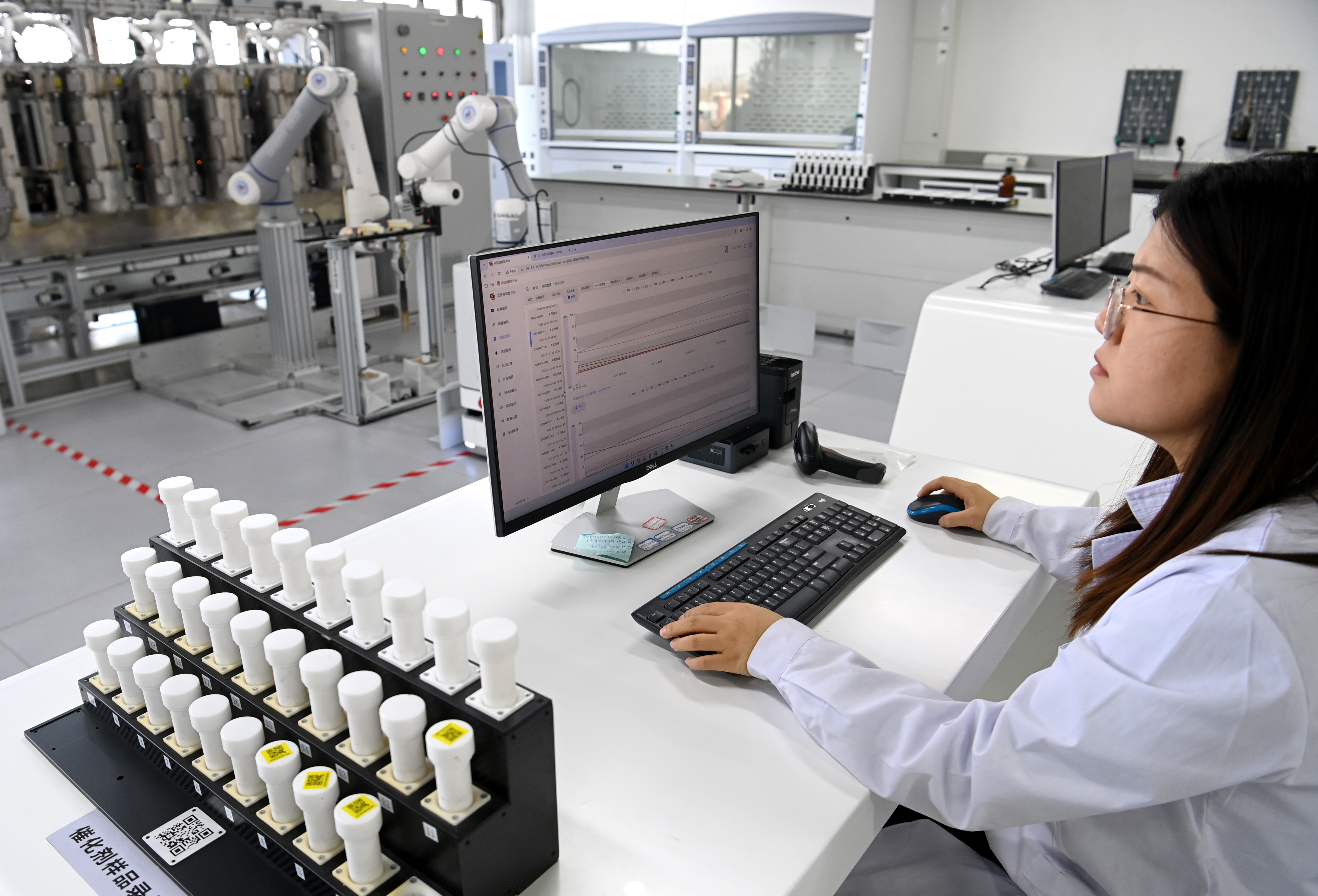 2024年2月28日,工作人员党小梅在陕西榆林中科洁净能源创新研究院基于人工智能的高通量催化反应研究平台实验室进行实验。新华社记者 邹竞一 摄