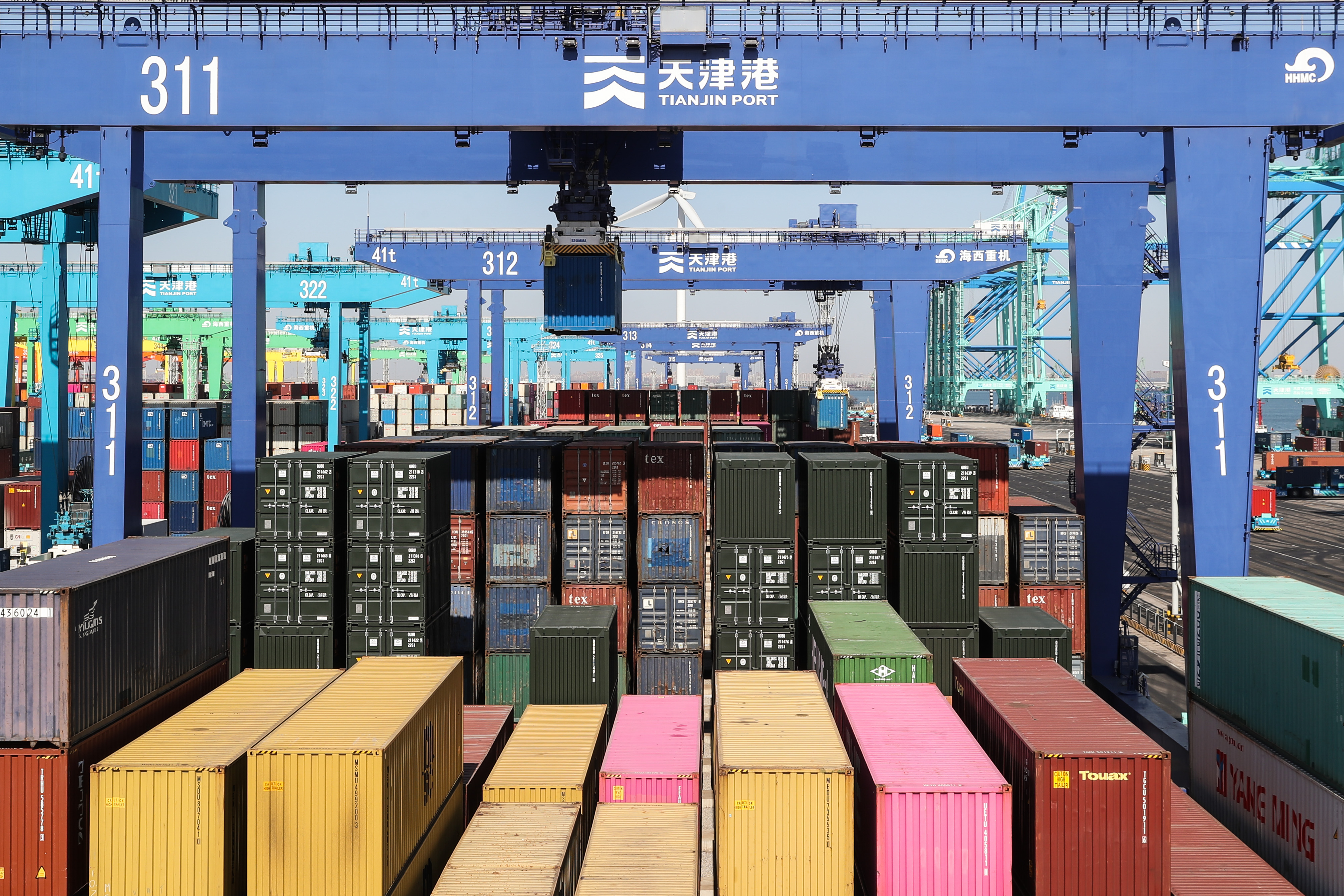 2024年3月1日,在天津港北疆港区C段智能化集装箱码头,起重机搬运集装箱。新华社记者 单宇琦 摄