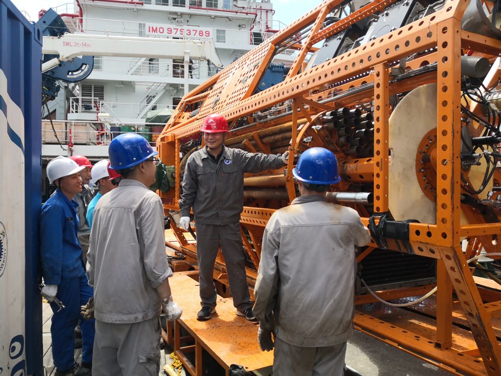 万步炎(右二)在科考船上为“海牛Ⅱ号”团队讲解钻机设计原理(2021年5月1日摄)。新华社发(金永平 摄)