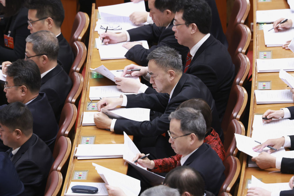 3月5日,第十四届全国人民代表大会第二次会议在北京人民大会堂开幕。这是代表们在认真听会。