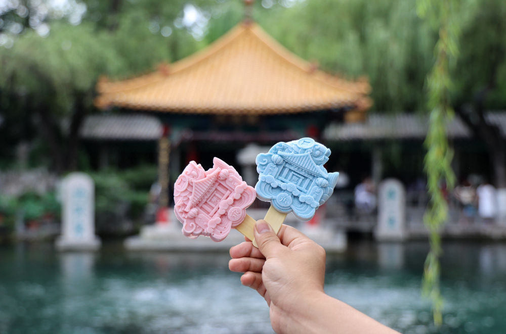 2023年7月16日在山东省济南市趵突泉景区拍摄的趵突泉造型文创雪糕。各具特色的文创雪糕在炎炎夏日里受到人们欢迎。 新华社发(初宝瑞摄)