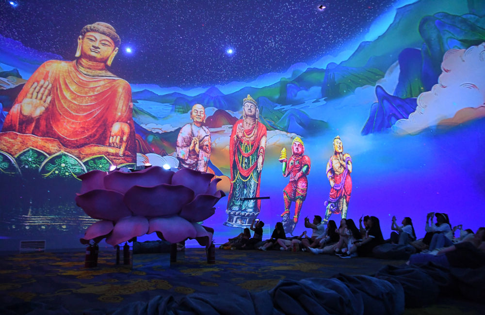2023年6月6日,游客在河南洛阳无上龙门沉浸式体验馆观看影片。洛阳大遗址保护和遗址公园建设亮点突出,一批集空间游玩、非遗体验、沉浸互动等为一体的文化场景次第涌现,优秀文创项目和产品破“圈”而出,让年轻人心向往之。 新华社记者 郝源 摄