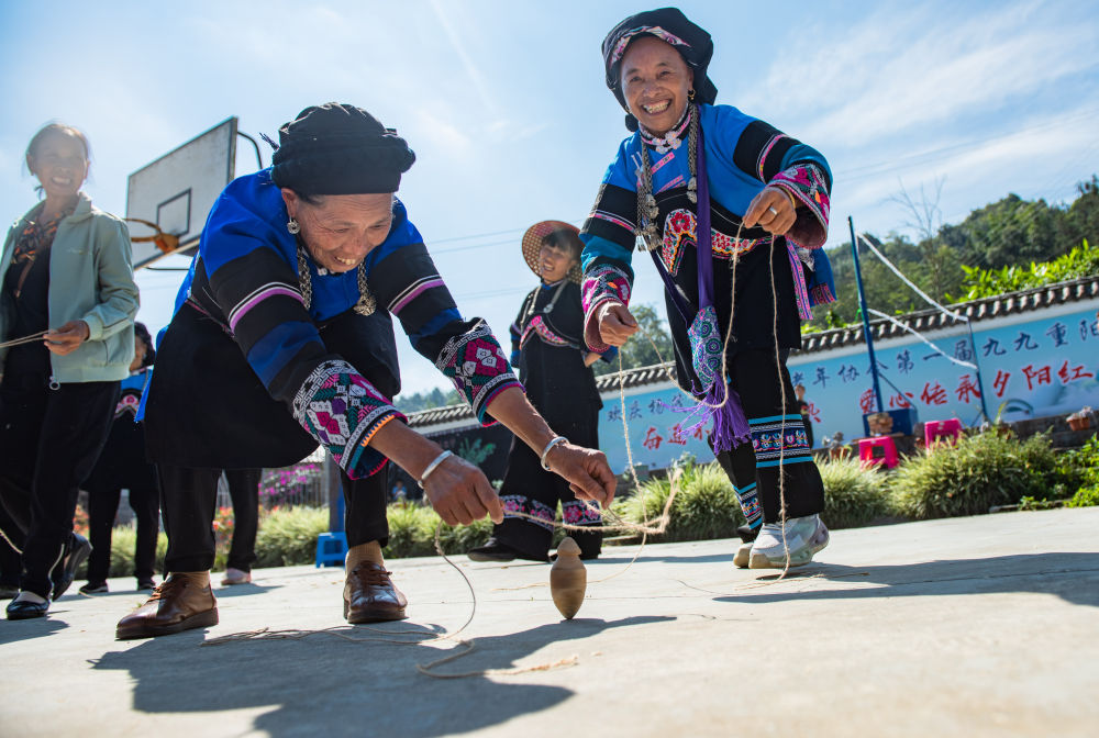 2023年10月22日,云南省文山壮族苗族自治州马关县木厂镇杨茂松村村民在重阳节活动中打陀螺。 新华社发(查宇波摄)
