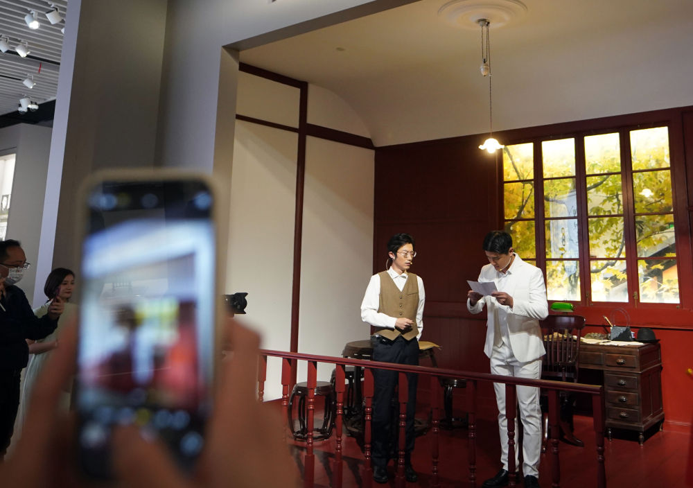 2023年5月18日晚,位于上海的中共一大纪念馆原创的情景党课《又见新青年》在展厅内实景演出。自2021年中国共产党成立100周年之际全新开放以来,中共一大纪念馆对红色文化的创新传播正不断“圈粉”年轻人。 新华社记者 刘颖 摄