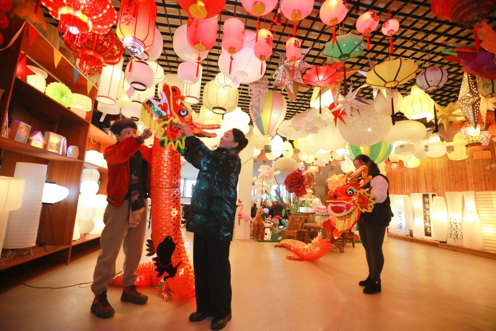 2024年1月29日,福建南平武夷灯饰有限公司工作人员在展厅内悬挂龙形灯笼。 新华社记者 刘莲芬 摄