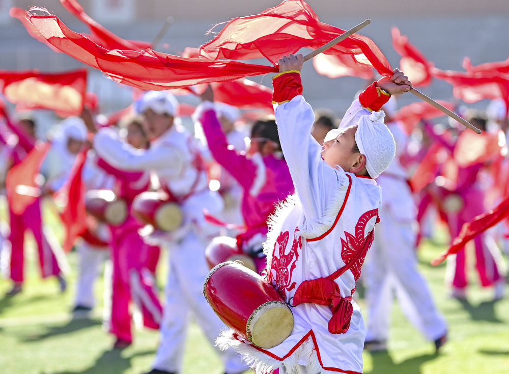 2023年11月16日,内蒙古鄂尔多斯市鄂托克前旗第二小学的学生在大课间表演安塞腰鼓。 新华社发(王正摄)