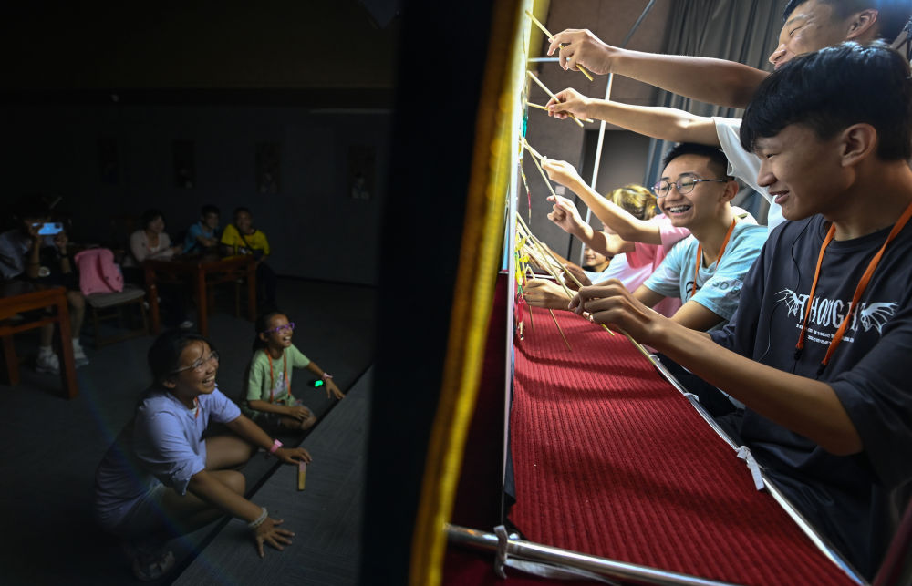 2023年8月8日,进行暑期研学的学生在位于西安的中国秦腔艺术博物馆里体验皮影戏演出。 新华社记者 邹竞一 摄