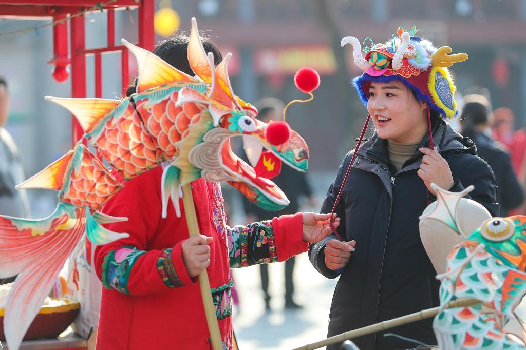 2024年2月13日,游客在河南商丘古城年货大集上购买龙帽。新华社发(李恒摄)
