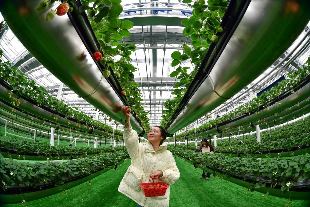 2023年12月28日,市民在肥西县柿树岗乡周楼村数字农旅果蔬大棚里采摘草莓。新华社发(徐勇摄)
