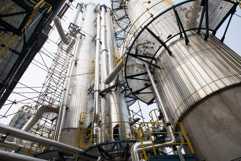 2023年12月28日,在淮北矿业集团碳鑫科技有限公司,工作人员在调试60万吨/年乙醇生产装置设备。新华社记者 金立旺 摄