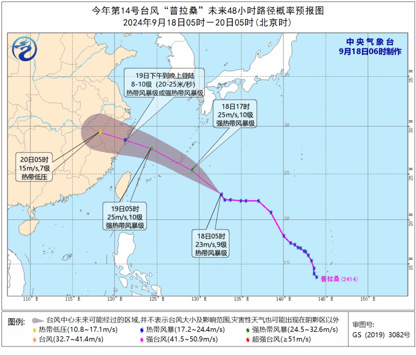 公众还需关注今年第14号台风“普拉桑”的最新动向。18日5时, “普拉桑”的中心今天位于琉球群岛那霸市东南方向约630公里的西北太平洋洋面上,强度为热带风暴级(9级,23米/秒)。预计,“普拉桑”将以每小时35~40公里的速度向西北方向快速移动,强度有所增强,18日晚上移入东海东部海面,19日下午到晚上在浙江沿海登陆(热带风暴级或强热带风暴级,8~10级,20~25米/秒),之后强度逐渐减弱。