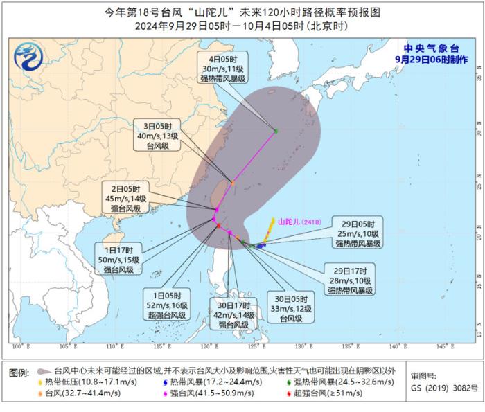 中央气象台9月29日06时发布台风蓝色预警:今年第18号台风“山陀儿”今天(29日)凌晨由热带风暴级加强为强热带风暴级,早晨5点钟其中心位于台湾省鹅銮鼻东南方大约505公里的西北太平洋洋面上,就是北纬18.7度、东经124.3度,中心附近最大风力有10级(25米/秒),中心最低气压为985百帕,七级风圈半径200-250公里。