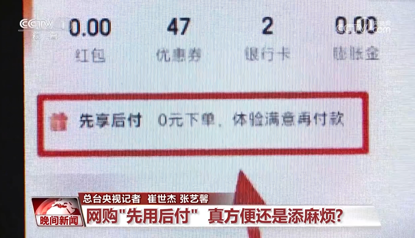 央视网消息:近期,各大网络购物平台先后推出了“先用后付”的购物方式,用户下单时不需要支付费用,确认收货后才会扣除费用。“先用后付”可以跳过刷脸和输入支付密码环节,让消费者一键完成购物。看起来简化了支付环节,但是,很多消费者反映,先用后付给自己带来了不小的麻烦。
