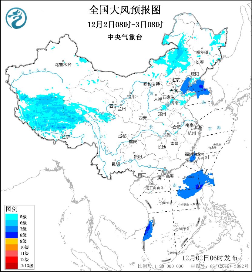 预计,12月2日08时至3日08时,西藏北部和西部、青海南部、内蒙古东部、黑龙江东部、辽宁南部、山东半岛东部、河南北部等地将有5~6级、阵风7~8级风;渤海、渤海海峡、黄海北部和中部偏北海域、台湾海峡、巴士海峡、南海东北部海域将有7~8级、阵风9级的大风(见图1)。中央气象台12月2日06时继续发布大风蓝色预警。