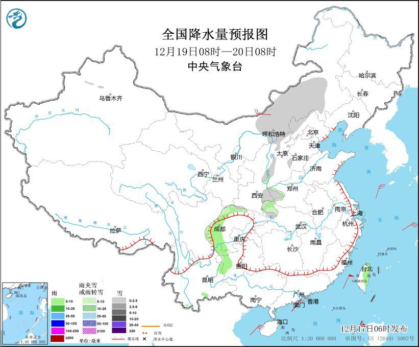 12月19日8时至20日8时,内蒙古中东部、陕西东部、山西西部、河北北部等地部分地区有小雪或雨夹雪。四川盆地西部和东南部、贵州西部、云南东北部、台湾岛东部等地部分地区有小雨。