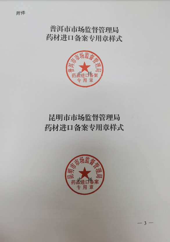 二、普洱市市场监督管理局和昆明市市场监督管理局分别承担勐康口岸和磨憨口岸(含磨憨铁路口岸)进口药材备案工作,在办理进口药材备案时使用“药品备案专用章”,印章式样见附件。