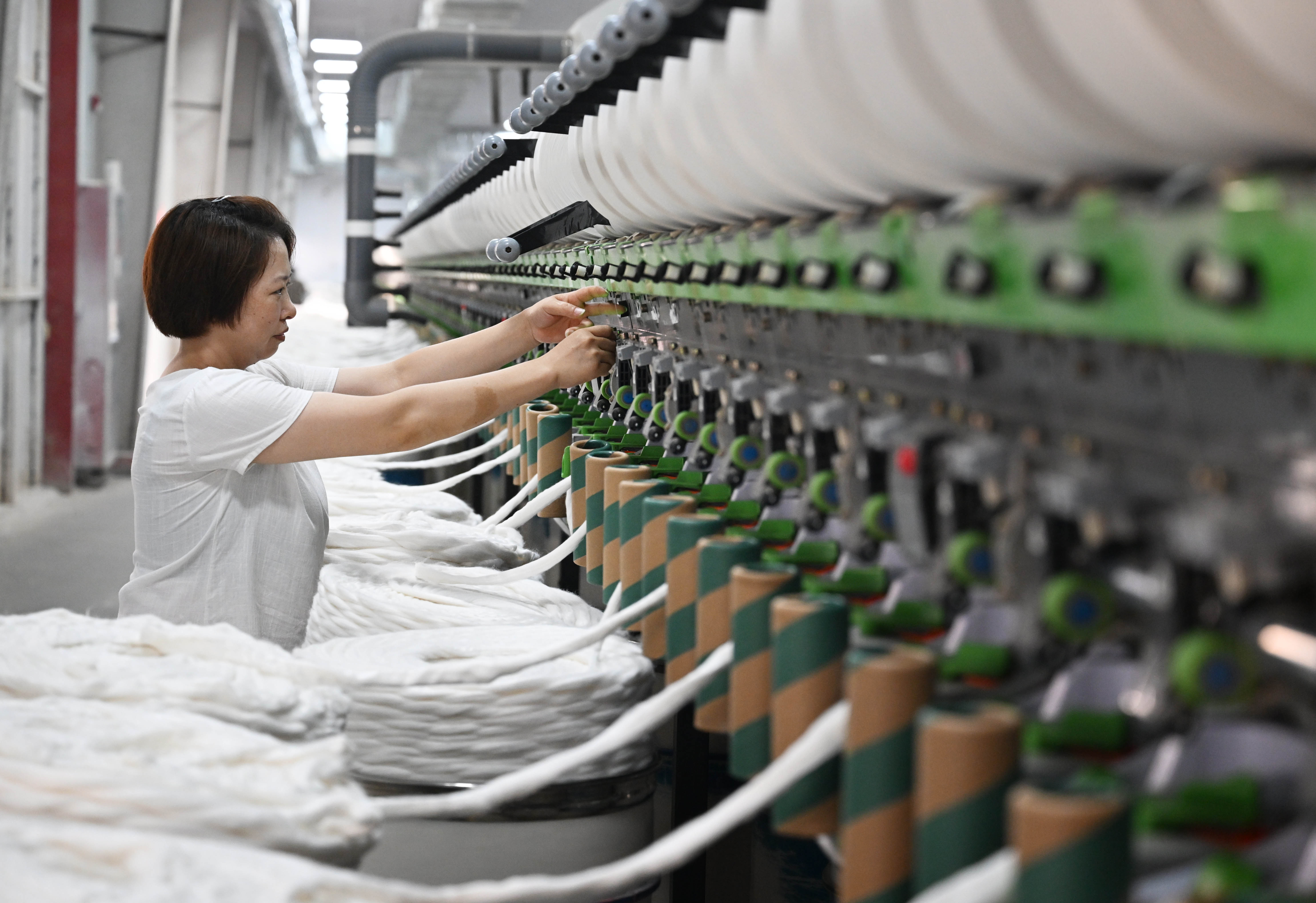 7月10日,在安庆浩冉纺织有限公司生产线,工人正在检查纺织品质量。记者 张大岗 摄