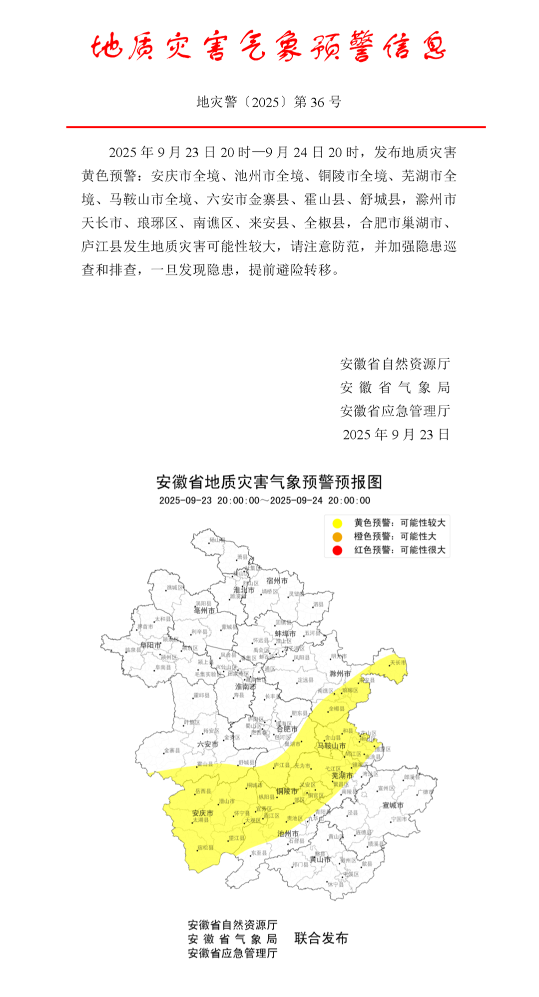 2025年9月23日20时—9月24日20时,发布地质灾害黄色预警:安庆市全境、池州市全境、铜陵市全境、芜湖市全境、马鞍山市全境、六安市金寨县、霍山县、舒城县,滁州市天长市、琅琊区、南谯区、来安县、全椒县,合肥市巢湖市、庐江县发生地质灾害可能性较大,请注意防范,并加强隐患巡查和排查,一旦发现隐患,提前避险转移。
