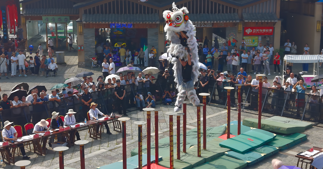 比赛现场氛围感拉满,成人组、青少年组、少年组三大组别依次亮相,高桩、南狮、北狮、群狮四大项目轮番上演。370名身怀绝技的舞狮武者辗转腾挪,将狮子出洞、探青、采青、嬉戏、沉睡、翻滚等神态动作演绎得惟妙惟肖,时而气势磅礴如猛虎下山,时而朝气蓬勃似稚童嬉戏,时而矫健威武若勇士出征。激昂的鼓乐声中,传统舞狮精气神被展现得淋漓尽致。