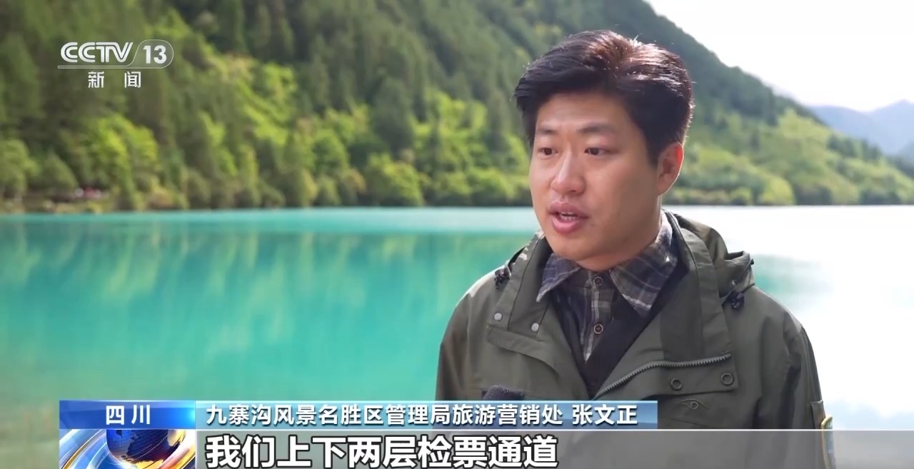 九寨沟风景名胜区管理局旅游营销处 张文正:我们上下两层检票通道,32个门闸机同时开放,可以确保游客在15分钟以内快速入园。同时投入了320到380辆观光车循环运行,对游客进行服务。