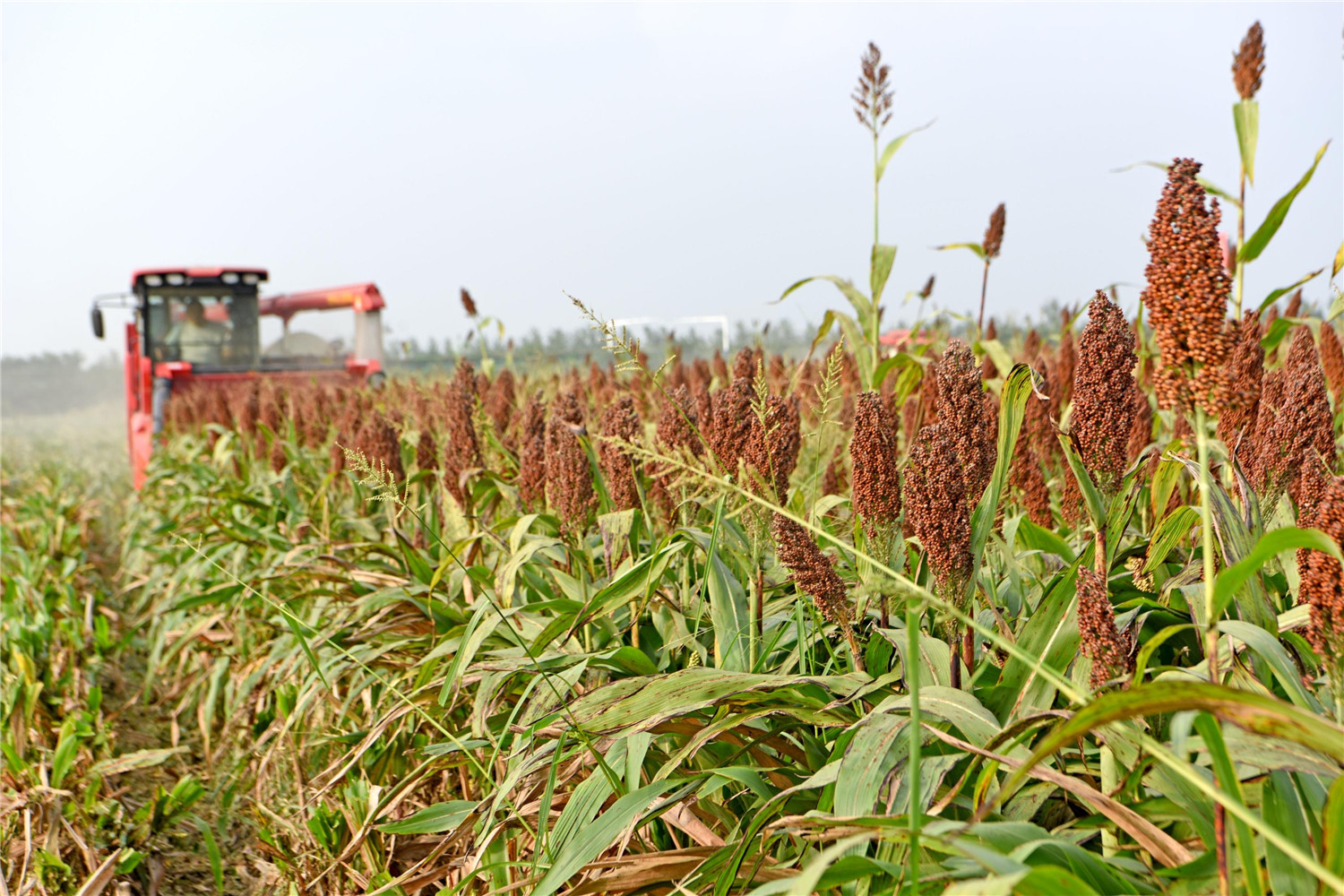 10月8日,安徽农垦集团淮南农场农机手在操作机械抢收高粱。目前,淮南市积极组织机械抢收秋粮,确保秋粮应收尽收。特约摄影 陈彬 摄