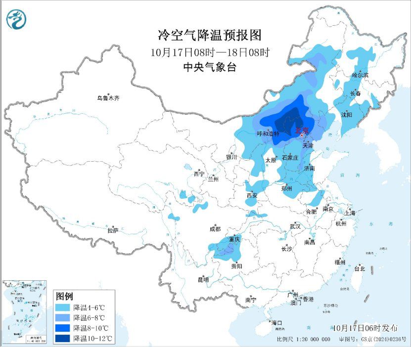 预计17-22日,较强冷空气将连续扩散南下,中东部地区气温将下降6~10℃,其中,华北中东部、黄淮中西部、江淮西部、江汉西部、江南北部和西部、华南北部、贵州等地部分地区降温10~12℃,局地超过14℃;过程最低气温0℃线将南压到华北北部至陕西北部、甘肃东部一带,大部地区将出现今年下半年以来最低气温。