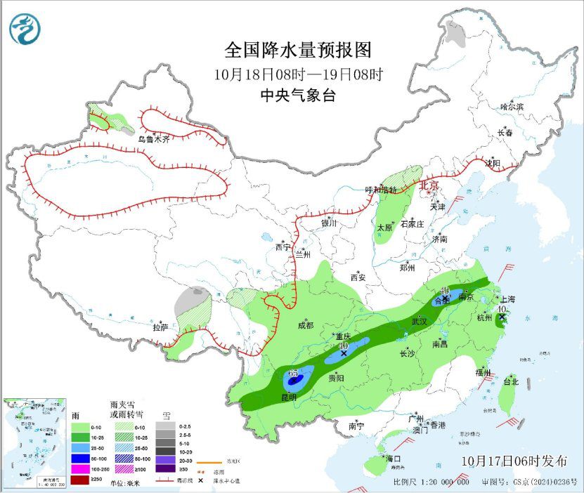 中新网10月17日电 据中央气象台网站消息,昨日,四川东北部、重庆北部、陕西南部、山西南部、河南西部、湖北西部、云南中部等地出现大到暴雨,四川东北部、陕西南部、湖北西部局地大暴雨。预计17日,较强降雨落区东移南压,重庆东部、贵州北部、湖北中西部、湖南西北部、河南中东部、山东南部、安徽北部、江苏北部等地有大到暴雨,局地有大暴雨。明天,降雨落区进一步南压,降雨强度显著减弱。