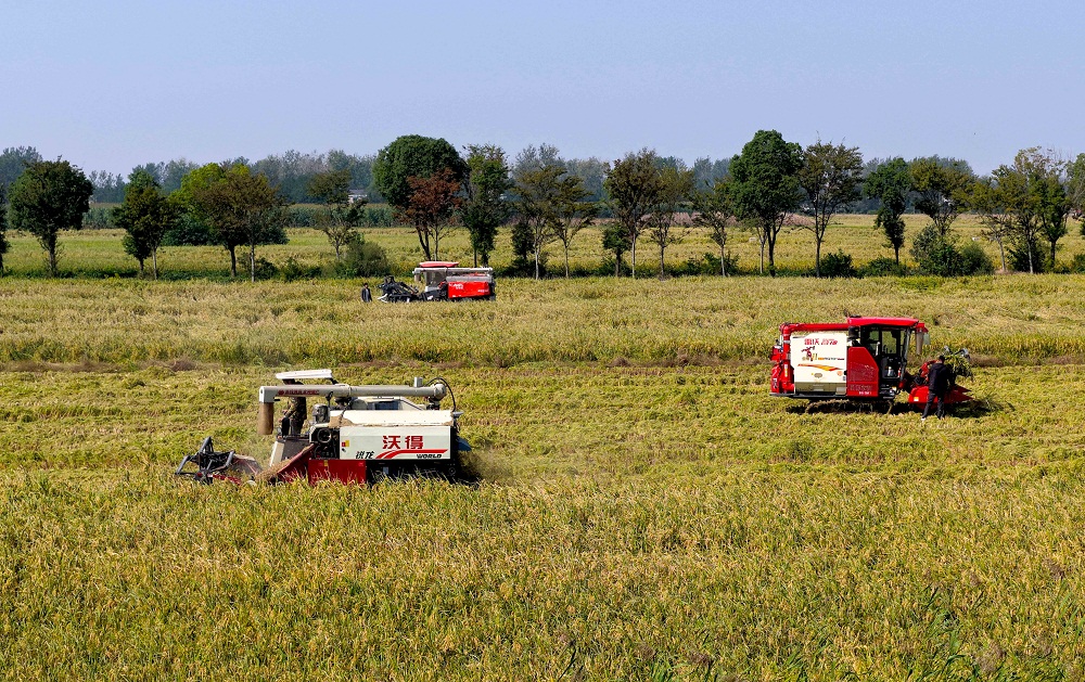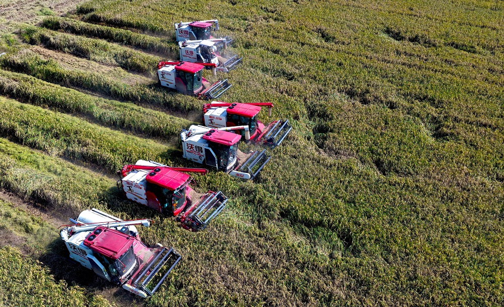 金秋时节。亳州市利辛县马店孜镇种植的3000多亩“旱改水”农田水稻迎来收割期,当地农民抢抓农时,抢收水稻,确保颗粒归仓。