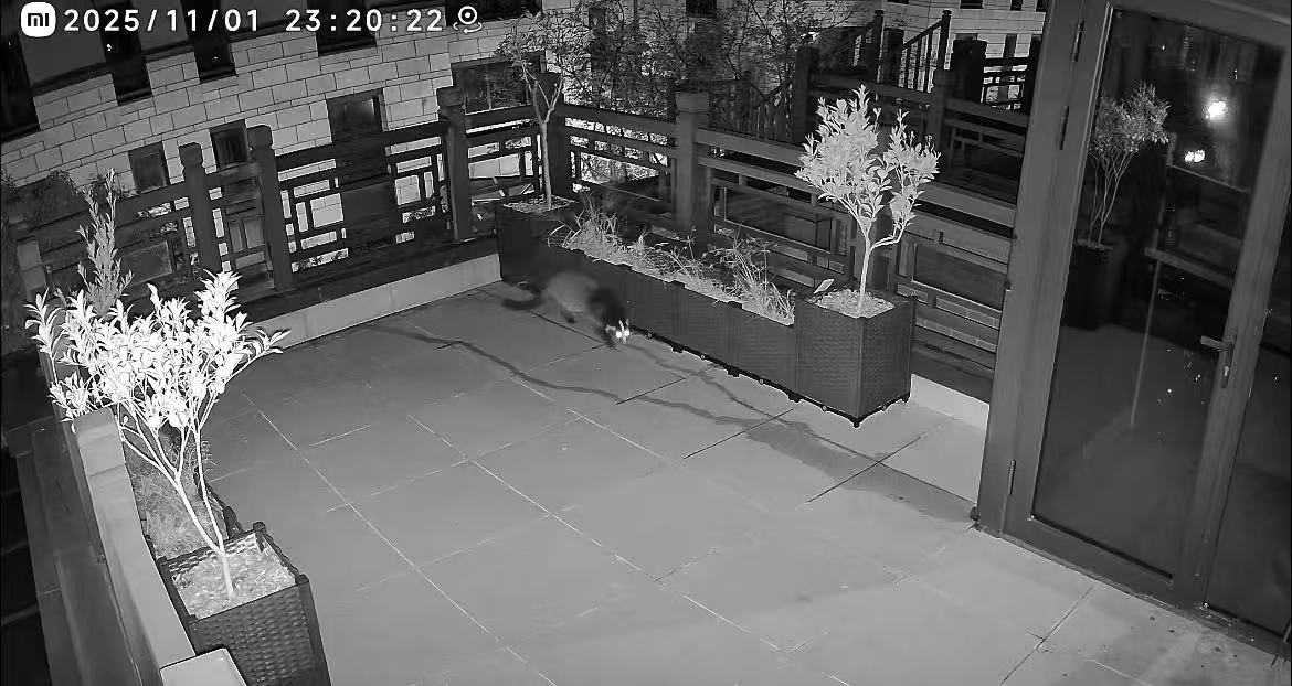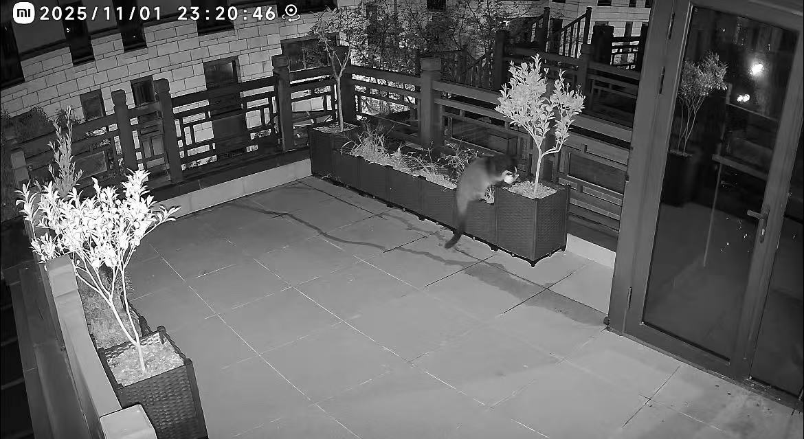 记者从胡先生提供的监控录像看到,11月1日深夜23:20,一只动物从3楼平台外面的围栏爬了进来,该动物形态似狗非狗、似猫非猫,体型中等,比家猫大一些,动物的头部和尾巴毛色漆黑油亮,眉宇间略带白色皮毛。该动物两眼发亮,四肢短粗。它爬到了平台上的一棵桔子树下,随后站起来摘下树上的一个桔子放在地上,用嘴巴将桔子皮剥开后开始吃桔子。