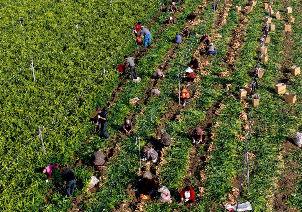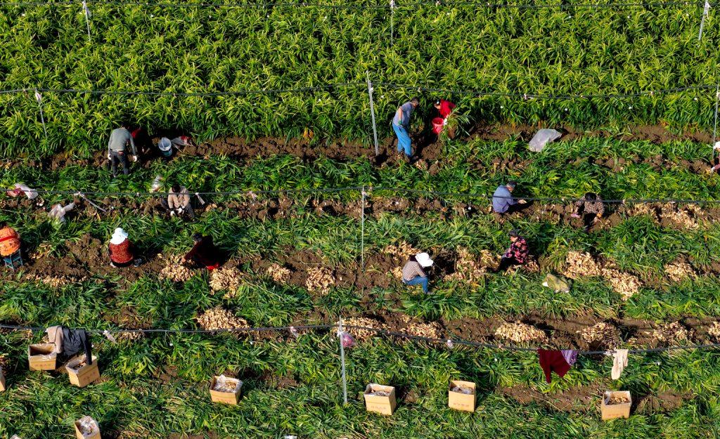 深秋时节,亳州市利辛县巩店镇种植的600多亩生姜喜获丰收,农民们趁着晴好天气,抓紧采挖、分拣、装箱、供应市场等工作,田间地头一派繁忙景象。据种植户介绍,今年生姜亩产达12000斤,每亩可为他们带来20000多元的经济收入。