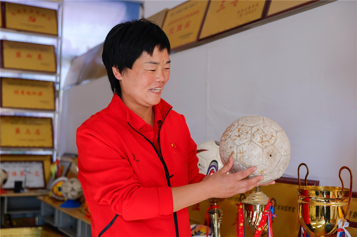 王侠在三义学校荣誉陈列室拿着她使用的第一个足球。