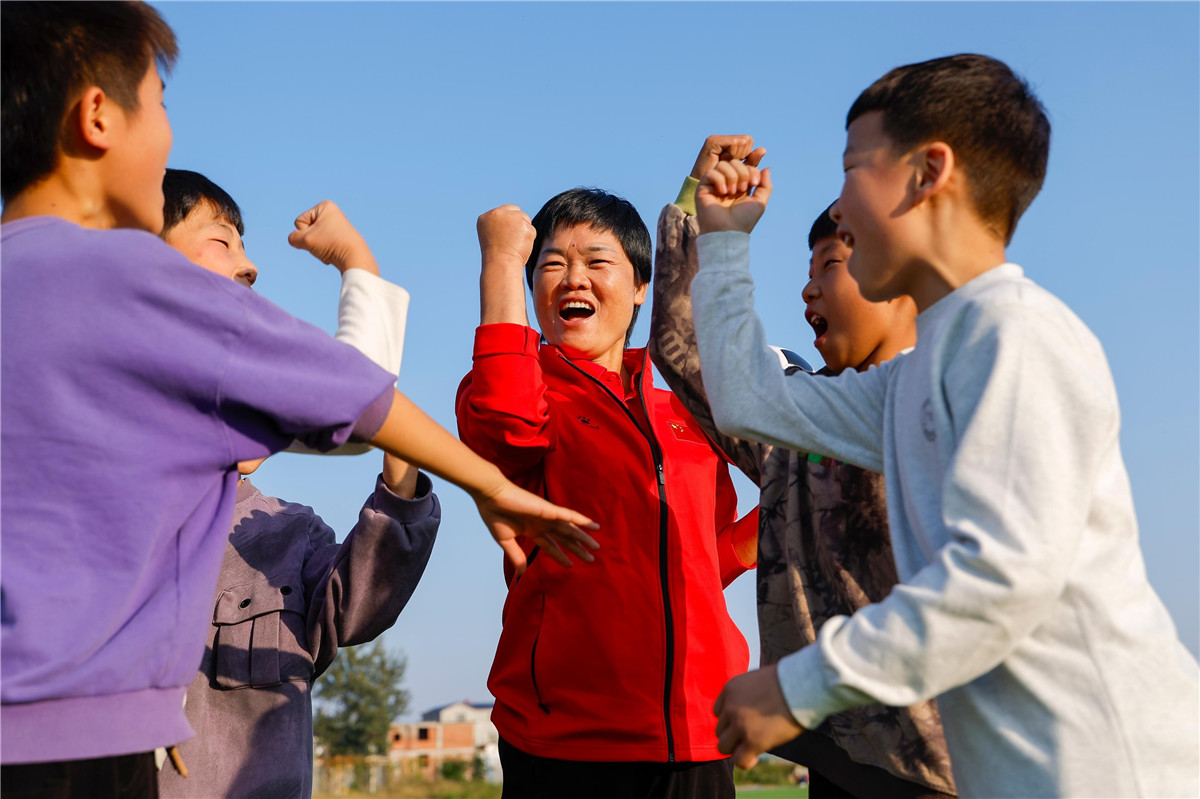 10月22日下午3点半,在阜阳市颍泉区行流镇三义学校足球场上,穿着红色运动服的体育老师王侠,在暖阳下十分醒目。此刻,她正带着10个孩子训练足球。