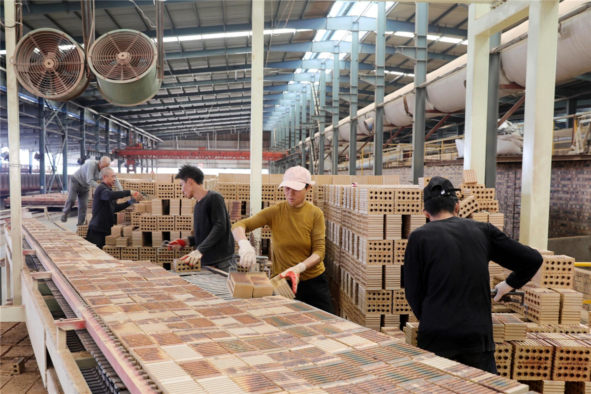 11月5日,工人在淮北市濉溪县南坪镇一家煤矸石生产烧结砖企业生产线上作业。近年来,淮北市以废弃煤矸石为核心原料,研发生产新型环保空心砖、多孔砖,让“黑色废料”变身“绿色建材”。本报通讯员 万善朝 摄