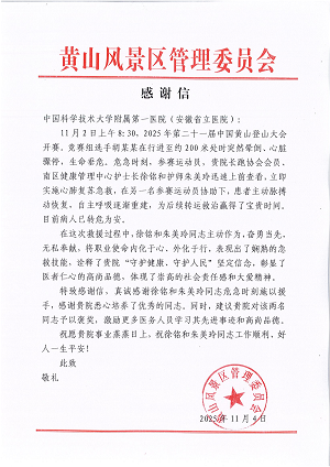 顺利完赛的三人心系患者的安危。该参赛者被转运至赛事定点医院进一步治疗后,生命体征趋于平稳,并在当天下午要求出院,现已返回当地继续治疗。事后,中国科大附一院收到了来自黄山风景区管委会的感谢信,对徐铭和朱美玲在危急时刻施以援手表示真挚感谢。