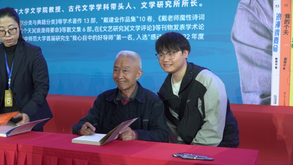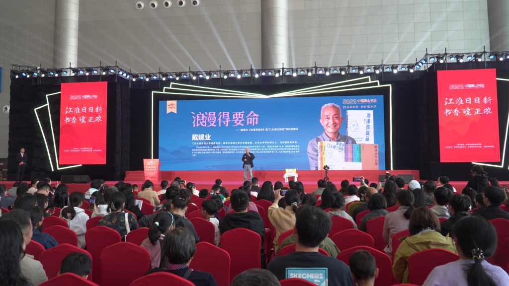 牛仔裤、运动鞋,一口“不普通”的“麻城普通话”,“国民教授”戴建业来合肥了。11月16日,戴建业带着新书《浪漫得要命》亮相黄山书会,与安徽读者现场交流。他走到读者中间,聊阅读、聊爱情、聊教育……讲到教育的时候,他摸了摸旁边孩子的头,让家长们别焦虑。现场不时有年轻读者兴奋地交流:“他好可爱啊。”
