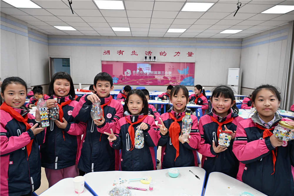 11月18日,小朋友们在展示利用废旧瓶罐制作的工艺品。当日,合肥市包河区滨湖世纪社区组织志愿者走进合肥市师范附属第三小学,开展“垃圾分类进校园 争当环保小卫士”主题宣传活动,为小朋友们讲解垃圾分类知识,并开展互动实践、变废为宝主题创作,组织小朋友做垃圾分类小游戏,寓教于乐引导小朋友争当环保卫士。
