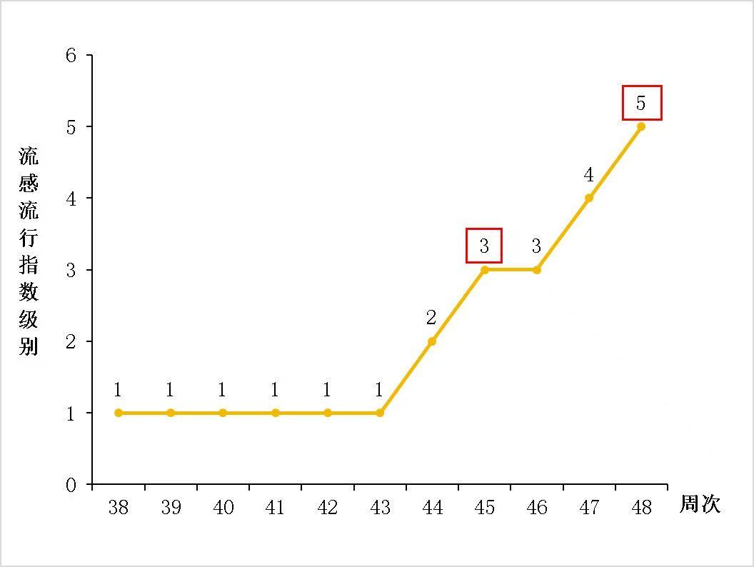 据了解,安徽省流感流行等级于2025年第45周由第2级提升至第3级,标志着进入流感活跃期。2025年第48周(11月24日—11月30日),流感活动将达到高水平,公众感染风险增高。