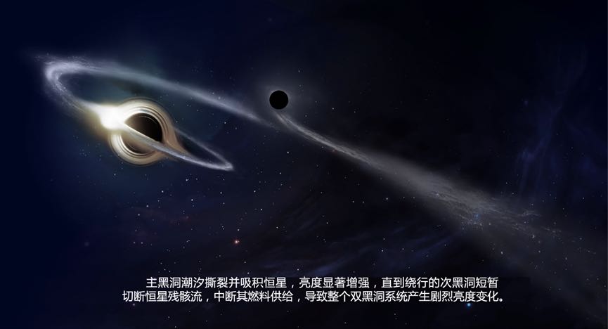 “这种现象预示着可能是一例发生在超大质量双黑洞系统中的潮汐撕裂恒星事件。”薛永泉教授解释,与普通的单黑洞潮汐撕裂恒星事件不同,当一颗恒星被主黑洞撕裂,恒星残骸流可能会被次黑洞干扰,导致无法正常回落到主黑洞,物质供给的中断导致光度骤然下降;当次黑洞远离后,恒星残骸流又能正常回落到主黑洞,于是主黑洞继续吸积残骸从而恢复光度。