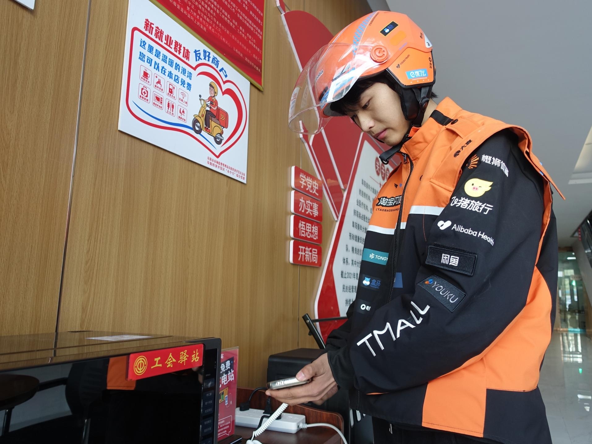 11月27日,在阜阳一工会驿站内,一名外卖员在给自己的手机充电。冬季来临,阜阳市的工会驿站、爱心驿站陆续开启“温暖”模式,用实际行动关爱户外劳动者。特约摄影 王彪 摄