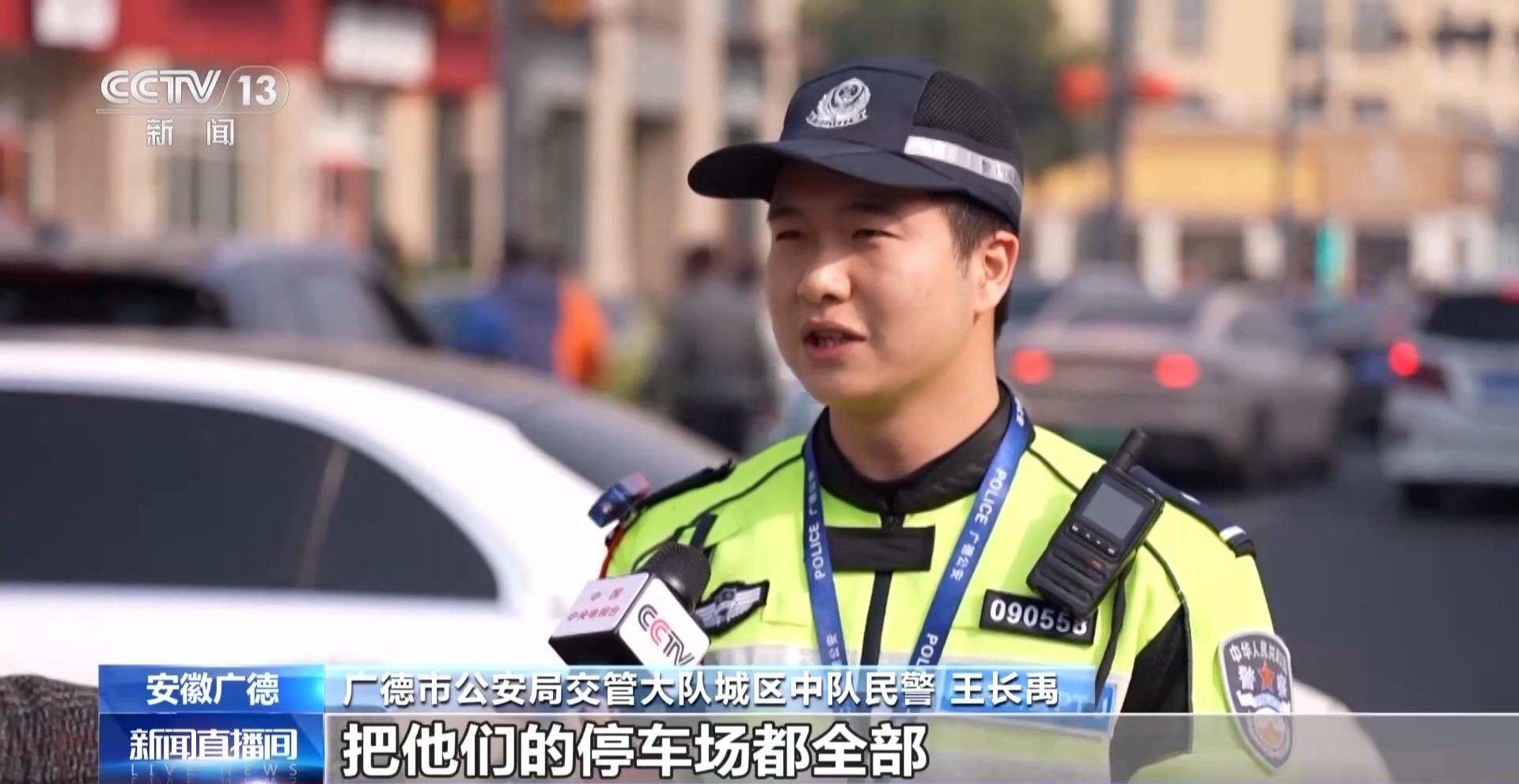 广德市公安局交管大队城区中队民警 王长禹:我们广德政府单位以及我们个人单位,把他们的停车场都全部向我们外地游客免费开放。在道路两边,我们公安交警部门还划定了临时停车位,供外地游客停车。另外广德政府还开设了专门的旅游大巴线,用一条线串起多个热门区域,让外地游客静心打卡我们的“广德三件套”。