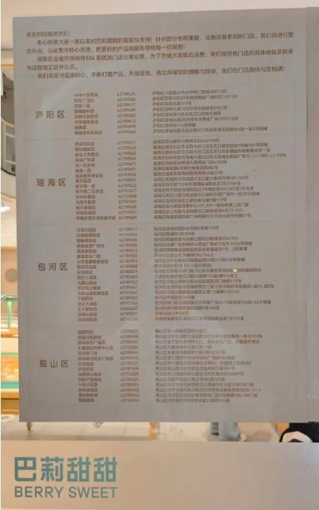 “说明”同步公示了庐阳区、瑶海区、包河区等多区域门店的具体地址及联系电话,方便消费者就近消费。巴莉甜甜表示,将坚守品质初心,持续打磨产品与服务,感谢消费者的理解与陪伴