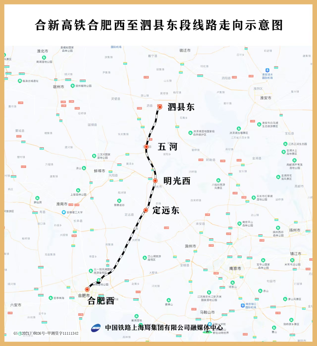 据介绍,合新高铁起自我省合肥市蜀山区的合肥西站,经我省滁州市、 蚌埠市、宿州市,江苏省宿迁市、 徐州市, 接入位于江苏省徐州市新沂市的新沂东站,线路全长约335公里, 设计时速350公里, 实行分段建设, 此次开通的为合肥至泗县段, 其余区段正在有序推进中。合新高铁合泗段起自合肥西站, 经滁州市定远县、明光市,蚌埠市五河县, 接入位于宿州市泗县的泗县东站, 线路全长198公里, 全线共设合肥西、定远东、明光西、五河、 泗县东5座车站,均为新建车站。