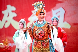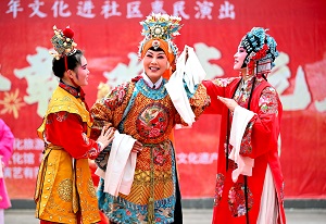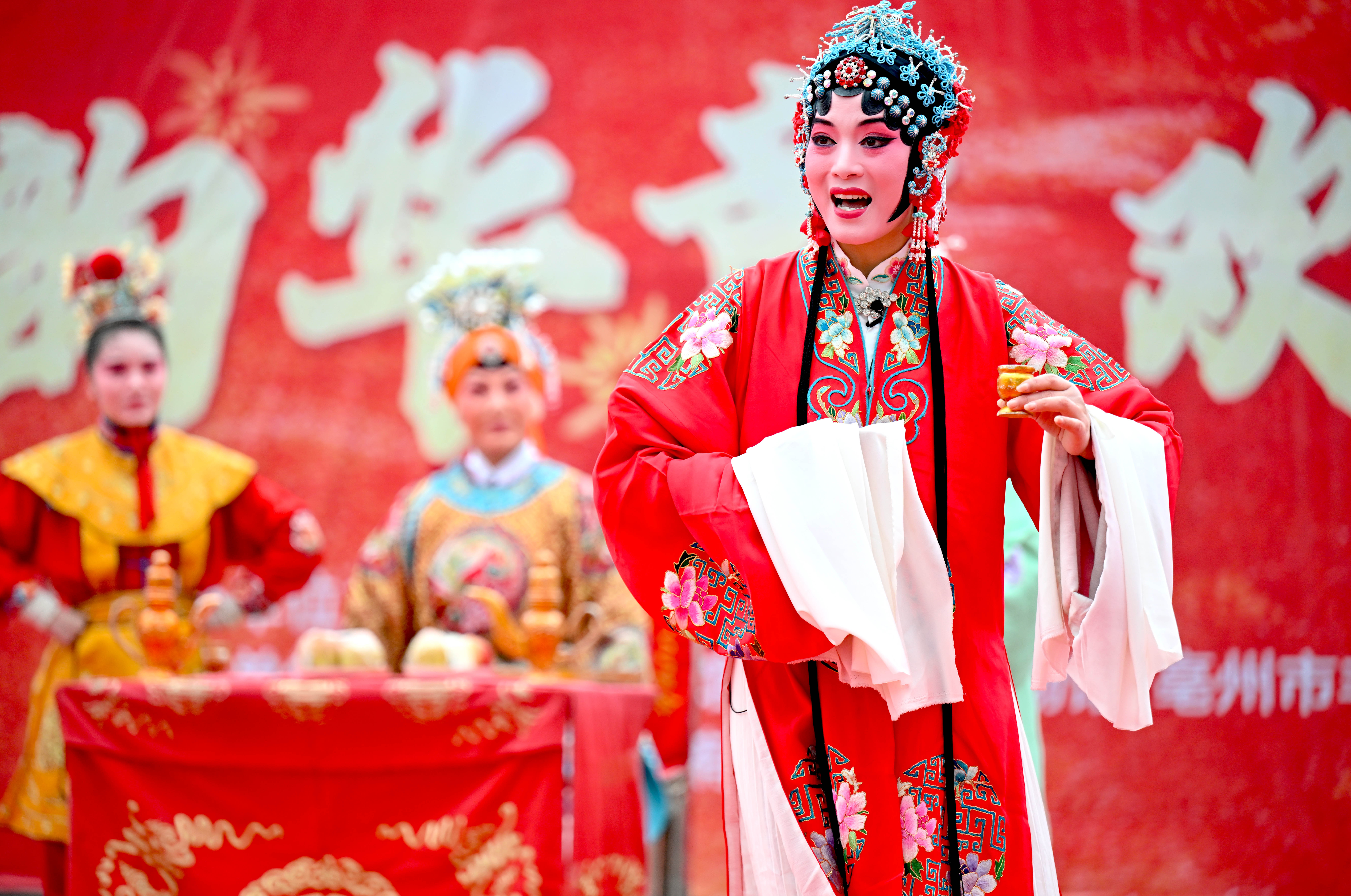 12月31日,在亳州市谯城区魏武广场,演员在演出淮北梆子戏《五世请缨》。
