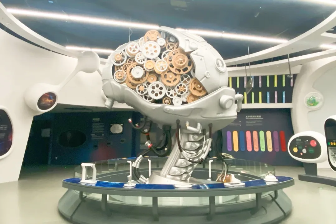今年5月,作为深圳市新地标,深圳科技馆正式开馆,成为深圳人朋友圈的“顶流”。在该馆的酷炫装置中,4.5米高的“超级大脑”吸引了众多市民互动参观。外观上看,“超级大脑”采用挑高空间设计,下方由仿真脊椎支撑,上方脑部为半开放结构,内部有众多齿轮以机械方式展示人类大脑内部运作机制。深圳科技馆介绍,“超级大脑”装置把机械和意识半脑巧妙结合,观众可以深入了解大脑的复杂结构和功能,从神经元到分区,再到脑电波和大脑对身体的控制,通过和装置台面的信息输入端互动,触摸不同部位还能触发相应脑区反馈,沉浸式探索大脑的奥秘。