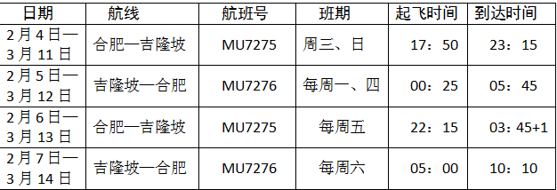 据介绍,合肥机场新开的至吉隆坡航线,由东航安徽分公司执飞,机型为空客A320。每周三、五、日,合肥飞往吉隆坡;每周一、四、六,吉隆坡飞往合肥,单程约5个多小时。