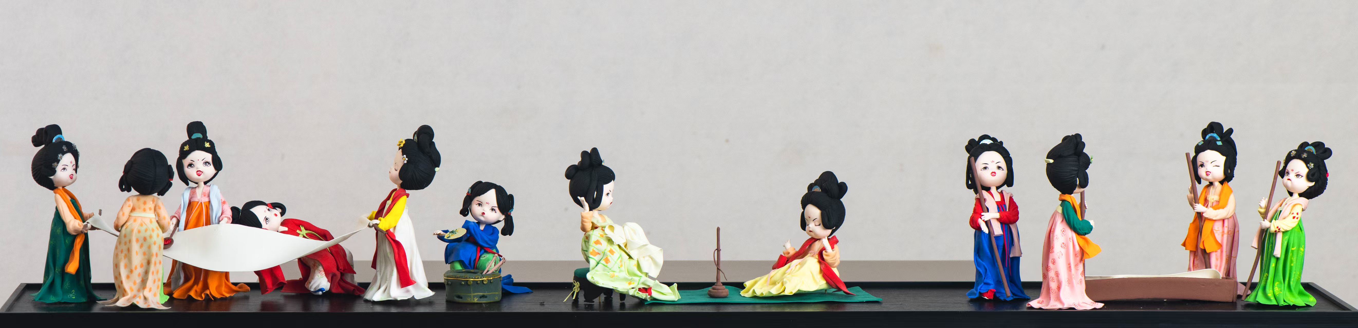 这些面塑人物,华丽的衣着轻盈灵动。涂有萧说,用面来塑造唐代人物,她除了细细观摩画作,还查了很多史料,考证唐代各个时期服饰的变化,并尝试用了新型材料来塑造衣服薄如蝉翼的轻薄质感。“在传统糯米粉、面粉里,加入了树脂、透明胶粉等,既能增强可塑性,也能避免塑造后干燥开裂,延长保存期。”涂有萧介绍说。
