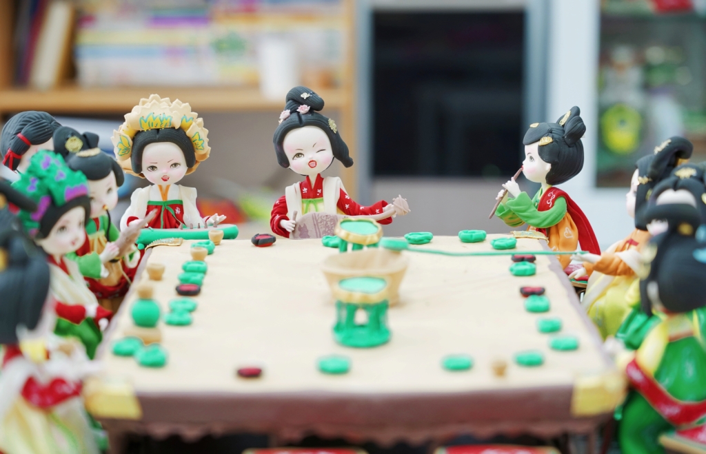 《簪花仕女图》《步辇图》《宫乐图》《捣练图》,这些唐代名画,通过涂有萧的一双巧手,用面塑将二维平面的画中人物,化作生动、立体的卡通形象,栩栩如生,衣着华丽,生动呈现了名画里的经典场景,让传世名作有了现代演绎。